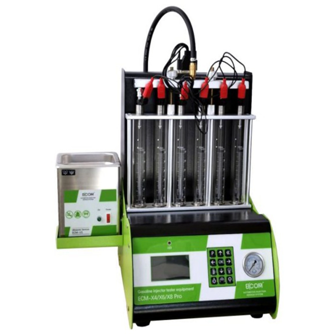The ECOM Injector Cleaning Machine is designed to test and clean fuel injectors for various types of engines including GDI, FSI, SIDI, MPI SPFI, TBI, CFI, K-JET, LPG, and motorbike injectors. It features advanced ultrasonic cleaning technology and a comprehensive testing system to ensure optimal injector performance.